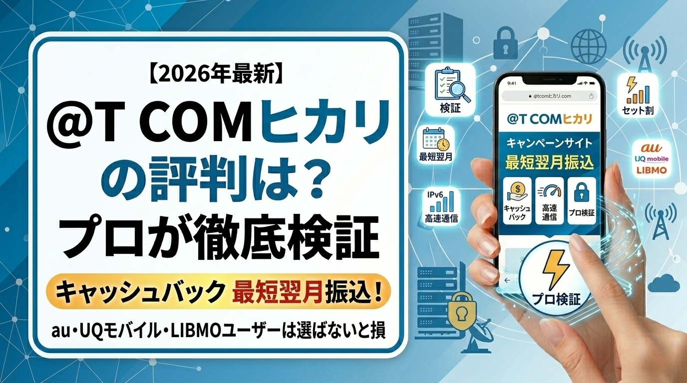 今、光回線選びのプロが注目しているのが『@T COM(アットティーコム)ヒカリ』です。最大のメリットは、キャッシュバックが「最短翌月」に振り込まれること。さらに、auやUQモバイル、格安SIMのLIBMOとのセット割で、家族全員の通信費を劇的に下げるポテンシャルを秘めています。