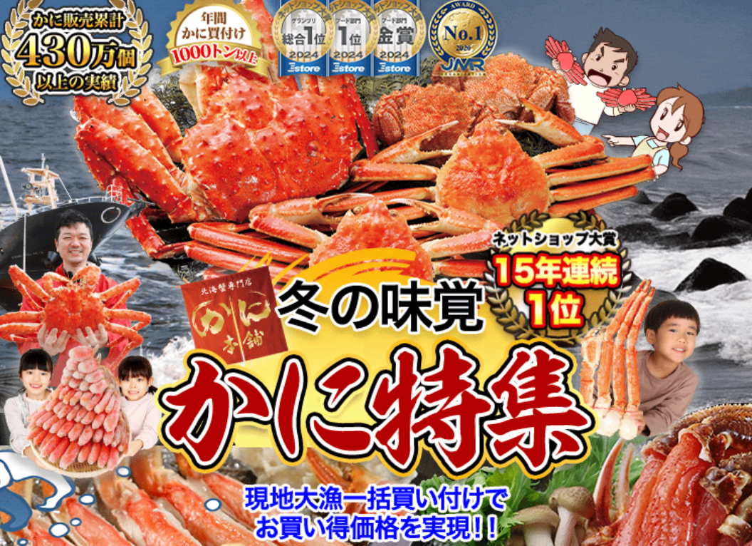 カニ通販で後悔したくないなら、販売実績・品質・コスパのバランスが優れたかに本舗は非常におすすめできます。 初めて通販でカニを注文する人でも安心して選べる人気ブランドで、特に年末年始は売り切れ必至。