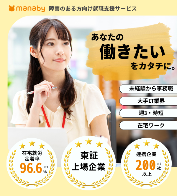 就労移行支援manabyは、通所と在宅を柔軟に組み合わせながらITスキルを学び、働く準備を整えられるサービスです。自分のペースを大切にしながら一歩ずつ前に進みたい方にとって、心強いサポートとなるでしょう。働き方に幅を持たせたい方、在宅ワークを視野に入れている方は、ぜひ一度チェックしてみてください。![]()