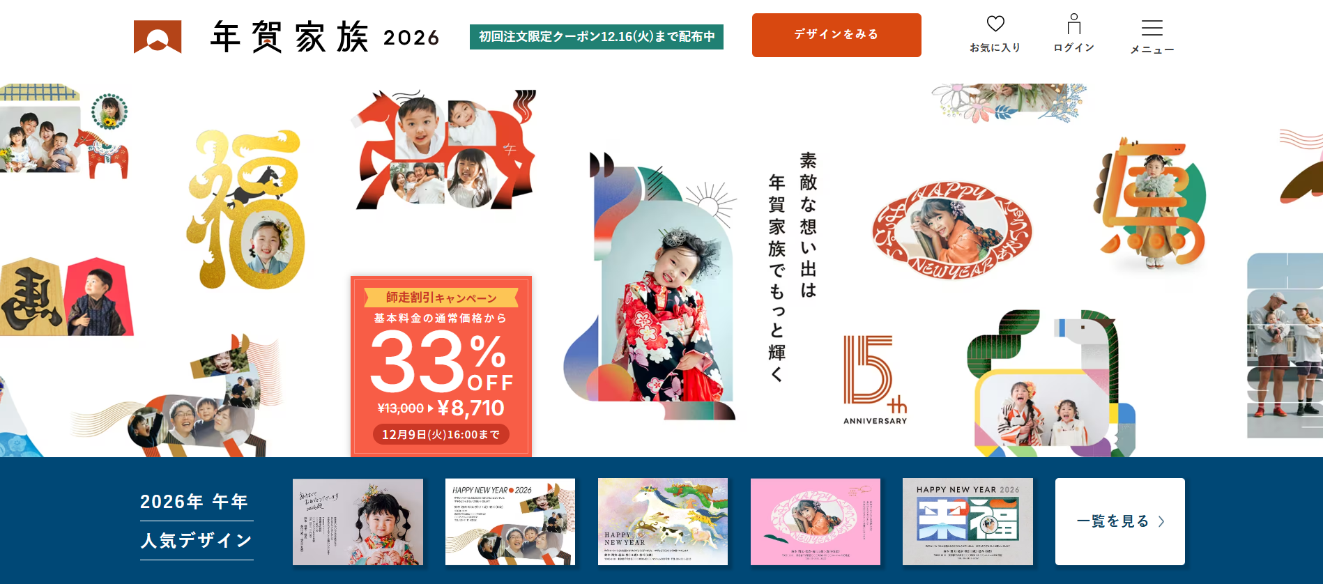 毎年の年賀状づくりを「もっとおしゃれに」「もっと手軽に」「もっと思い出に残る一枚にしたい」。そんな方に選ばれているのが、写真入りデザイナーズ年賀状サービス「年賀家族」です。